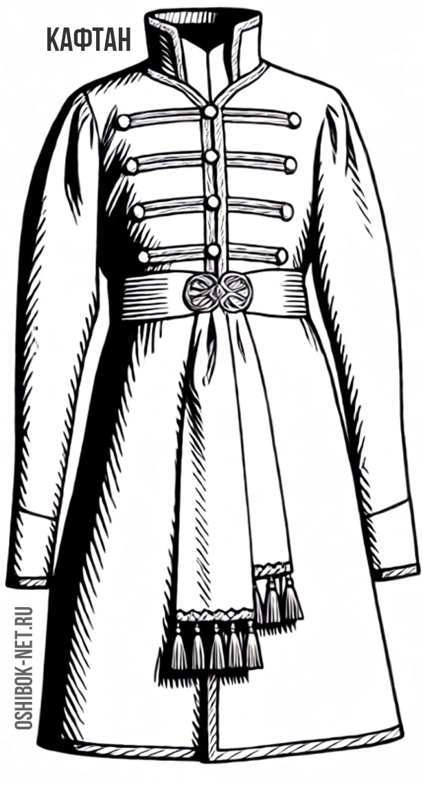 Так, сущ. кафтан – «мужская долгополая верхняя одежда» – пришло к нам, по мнению этимолога Н. М. Шанского, из тюркских языков, где возникло из сложения элементов кап («мешок, оболочка, футляр») и тон («вид мужской одежды»). Дипломат и писатель П. Левашов в «Цареградских письмах» (1789) упоминает кафтан при описании церемонии приёма иностранных послов в Османской империи: «После сего в знак чести надевают на него кафтан, подносят конфекты, кофе, шербет и окуривают благовонием…». Ясно, что кафтан в этом случае был подарком, изготовленным из дорогих тканей, и сильно отличался от повседневного крестьянского кафтана.