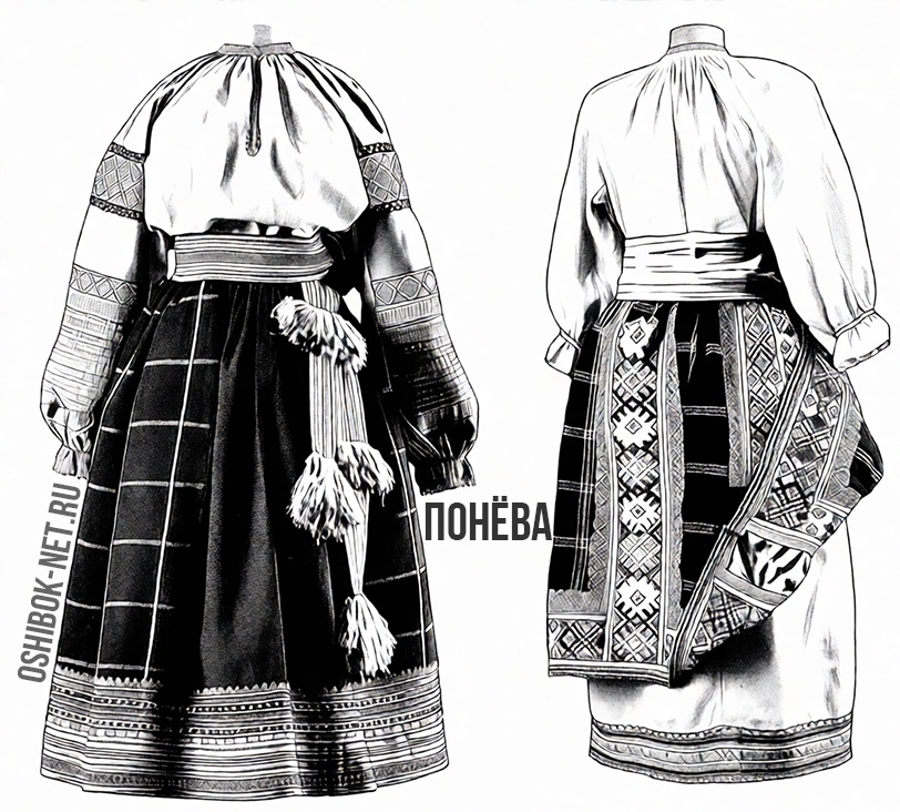 В холодное время с шушуном могли носить понёвы – «многослойные юбки из трёх (реже четырёх) полотнищ шерстяной или полушерстяной клетчатой или полосатой ткани». Слово, скорее всего, связано со старославянским опона, пьнѫ, пѧти – «натягивать». И если у южных славян была очень популярна юбка-понёва, то, по сведениям этнографа и писателя С. Максимова, в северных местностях понёвой «назывался женский головной убор в виде повязки».