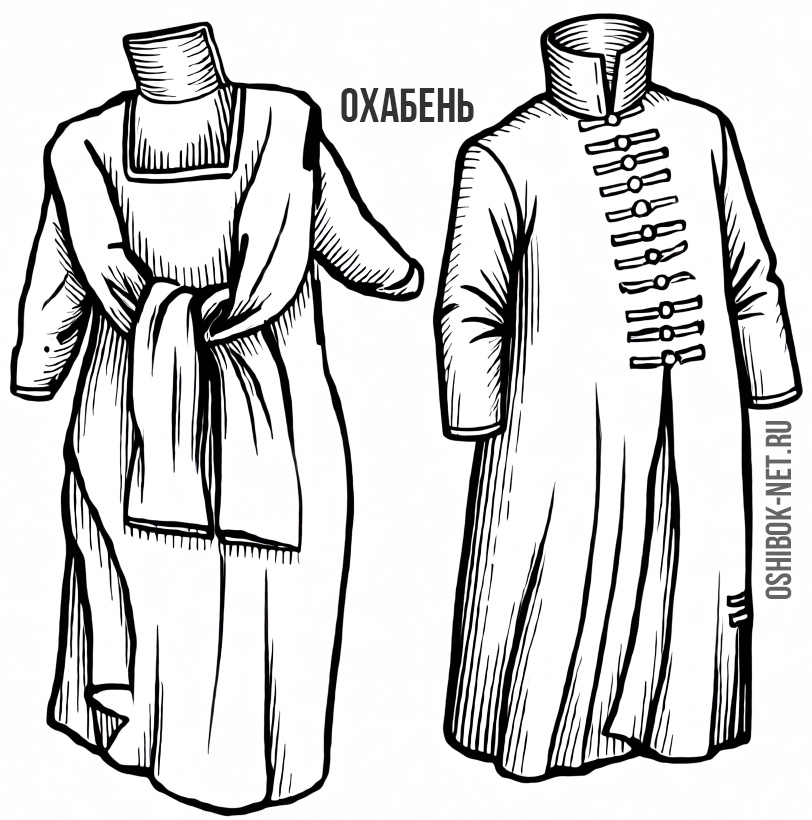 Исконным по происхождению является о́хабень (от гл. охабить – «охватить») – «широкий кафтан с большим откидным воротом и прорезями в длинных рукавах»: «Поверху он имел длинный охабень из красного бархата» (Ф. Булгарин).